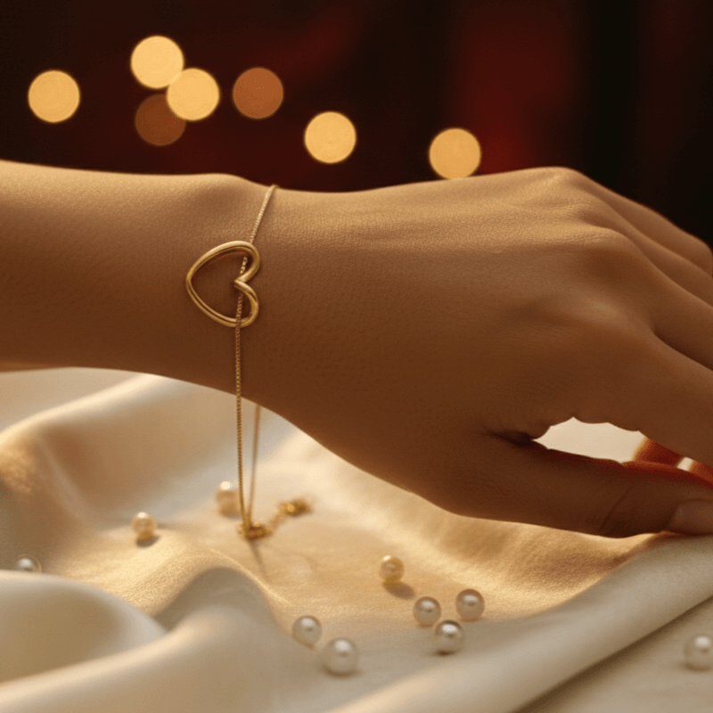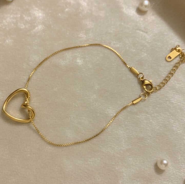 Aura Heart Bracelet – Pure Elegance on Your Wrist Add a touch of gold to your everyday look. This minimalist heart-shaped bracelet is crafted for the modern woman who loves subtle luxury. Perfectly adjustable and lightweight, it’s the ideal gift to show your love this season.