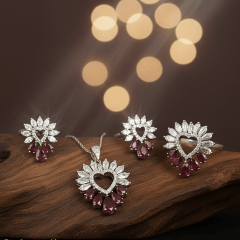 Embrace timeless romance with this exquisite 3-piece jewelry suite. Featuring a vibrant heart-cut ruby centerpiece framed by a shimmering halo of silver-toned petals, this set is designed to radiate elegance. Whether it’s a romantic dinner or a formal gala, the Crimson Heart Majesty Set ensures you stay the center of attention.
