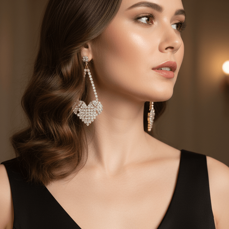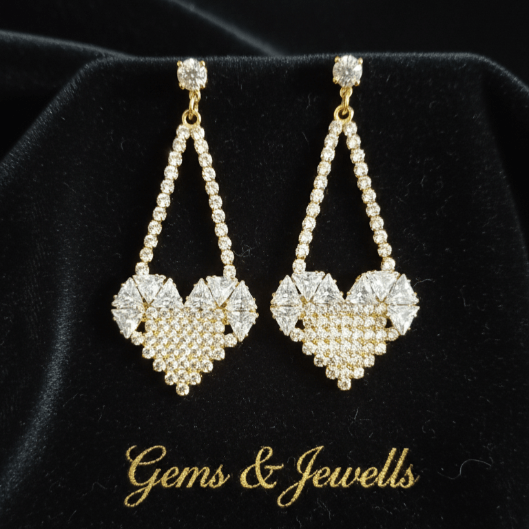 These stunning drop earrings by Gems & Jewells feature a sophisticated mosaic of diamond-cut stones arranged in a geometric heart silhouette. Suspended from brilliant round studs with an elegant gold-toned finish, they offer a bold yet refined look perfect for evening wear or special occasions.